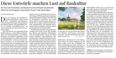 "Ein Forum als Darstellung- und Diskussionsforum der Bauentwicklung regional und international. Ein Ort im Zentrum der Stadt, ein Ort für Ausstellungen, Präsentationen, Vorträge, Preisverleihungen, Festivitäten und vieles mehr. Das Bau-Kultur-Forum der Stadt Stuttgart soll u.a. in Permanent- und Wechselausstellungen die aktuelle und historische Perspektive gebauter Projekte, Entwicklungen und Bautechnologien präsentieren. Neben der Stuttgarter Baugeschichte sollen die Fachrichtungen Architektur, Ingenieurbau und Design vertreten sein."
